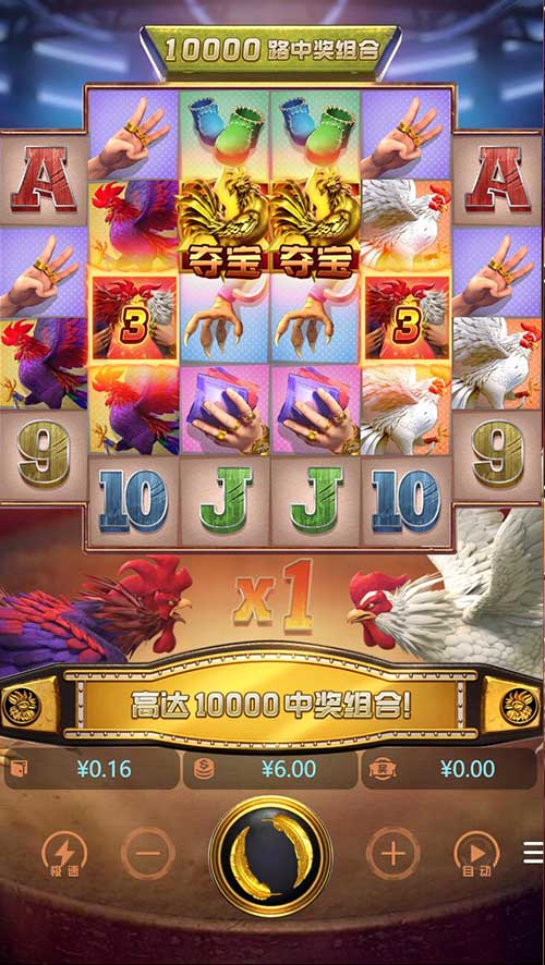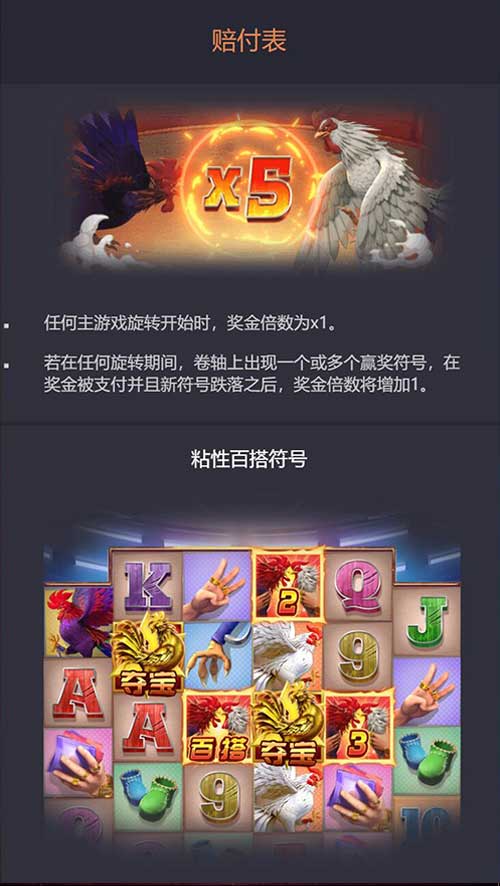 斗鸡是一个6轴4行(卷轴2、3、4和5各有额外一行)的视频老虎机游戏,编入了粘性百搭符号和奖金倍数。