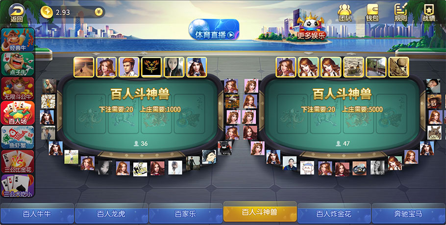百人斗神兽棋牌游戏中有一个庄家以及四个闲家板块(青龙、白虎、朱雀、玄武)游戏使用一副牌共52张牌(不含大小王)进行游戏。下注阶段玩家在四个闲家板块任意下注,发牌阶段为五个板块各发1张牌并进行比牌。
