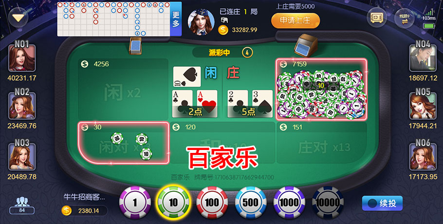 游戏中有“闲家”、“庄家”和“对子”三种投注选项。