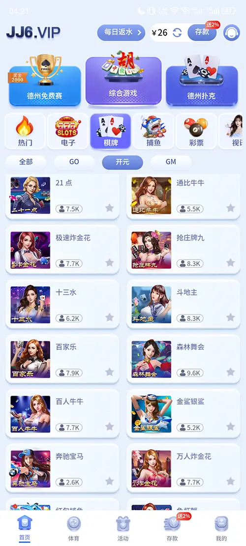 JJ6娱乐棋牌游戏平台拥有丰富的棋牌游戏种类,包括斗地主、麻将、扑克等多种经典玩法,还有各种地方特色的棋牌游戏,让您在享受游戏的同时,也能感受到不同地区的文化魅力。