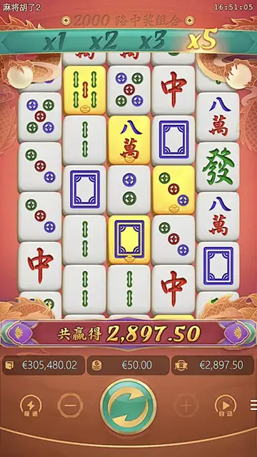 基础游戏与“胡了”机制: 游戏采用经典的网格旋转方式。最大的亮点在于其“胡了”系统。当旋转后出现获胜组合时,获胜符号会“爆开”并留下金色边框,随后新的符号从天而降进行“填充”,再次判定是否获胜。这个过程可以连续触发,形成“连环胡”,单次旋转可能带来持续不断的胜利,体验极佳。